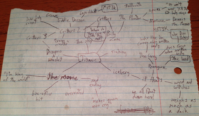 When I say write anything and everything that comes to mind, I do mean just that. Here’s an example of me doing this exercise with the Titanic as the topic.
